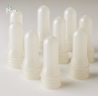 Transparent/Milky compostable preforms for bottles.